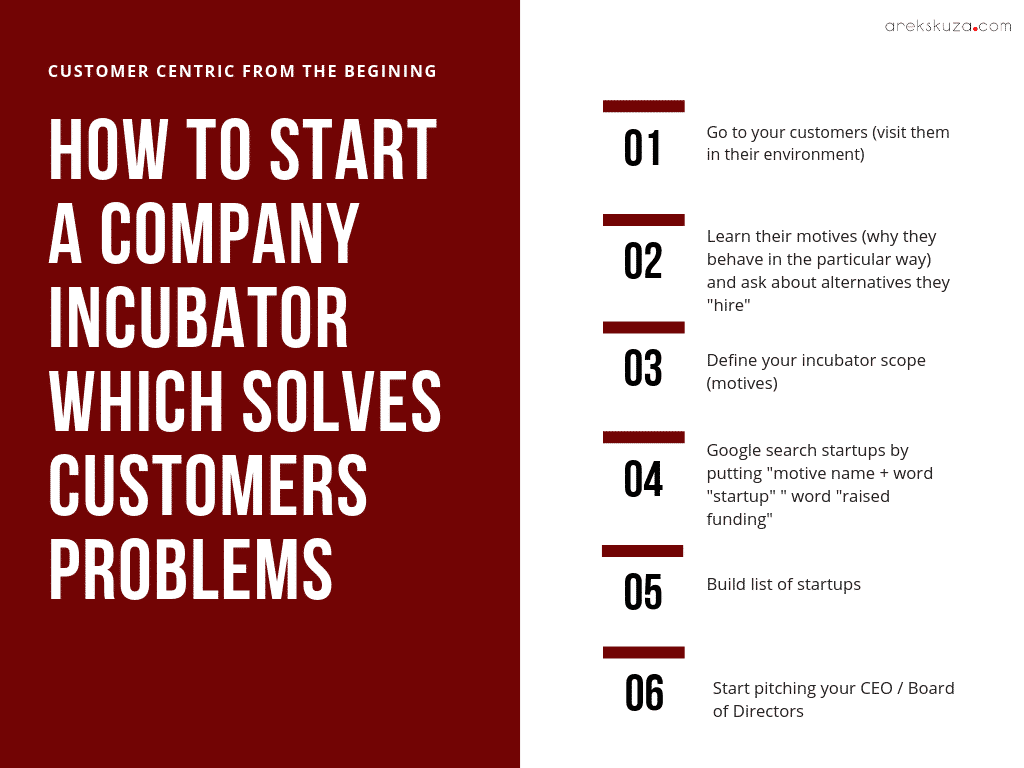 So, this is how you can start a company incubator which solves customer's problems from the very beginning. CEOs love it because it brings money, traction, and growth. Now you can be a chief of the customer-centric incubator, and you can start pitching your boss for building one and putting you in charge.